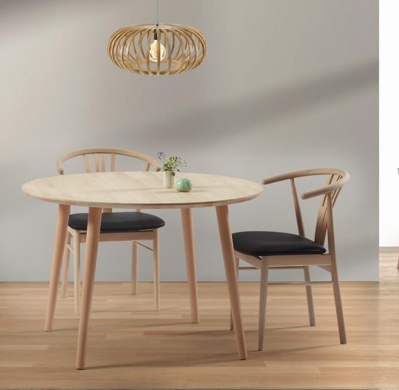 Spisebord med 2 tillægsplader – diameter 110 cm.
