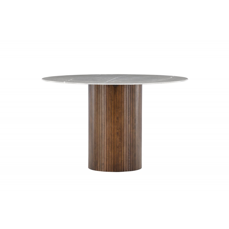 Haron spisebord har et unikt design med en lækker stenplade! Dette bord tilhører Vind-kollektionen og har en cylindrisk ramme i ribbet, mørkebrunt træ og en rund stenbordplade, som bringer liv til midtpunktet. Et rundt spisebord er perfekt til at skabe fællesskab under måltiderne, ingen bliver efterladt på kanten her. Kombinér det med et par komfortable spisebordsstole og forlæng de hyggelige stunder omkring bordet! Mål: Ø120 H74.