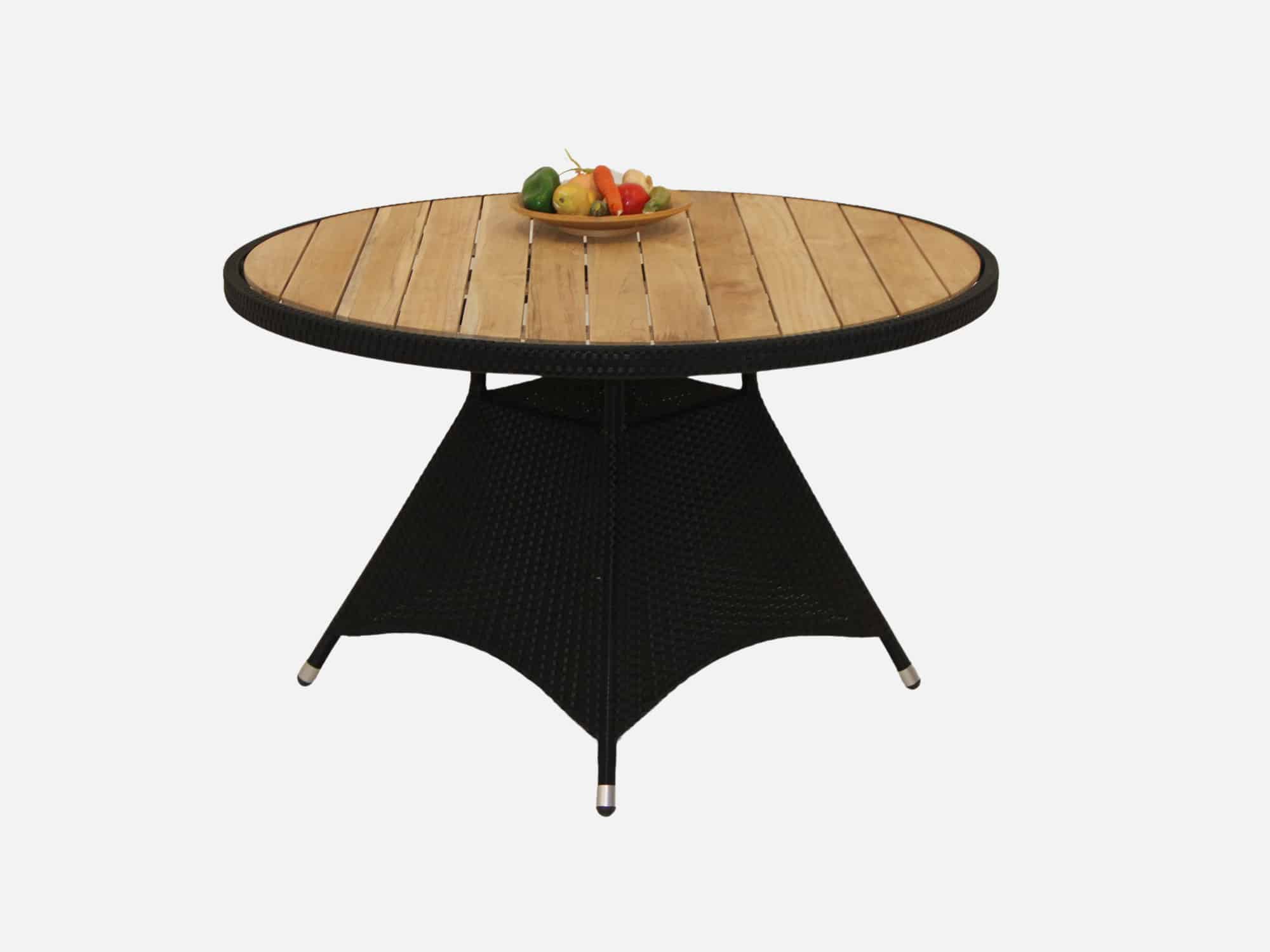 Havebordet er udført med aluminiums stel og sort polyrattan. Bordpladen er i teak træ.