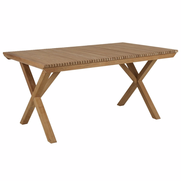 Smukt havebord i flot teak med små massive lameller, der giver bordet et lettere udtryk. Bordet måler 90 x 155 cm og er 73 cm højt. Kryds benene gør det lettere, at flere kan sidde ved bordet.