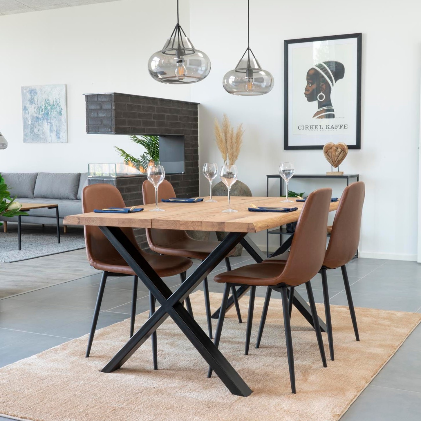 Moderne spisebord med kraftig bordplade og robust understel i sort krydset metal.