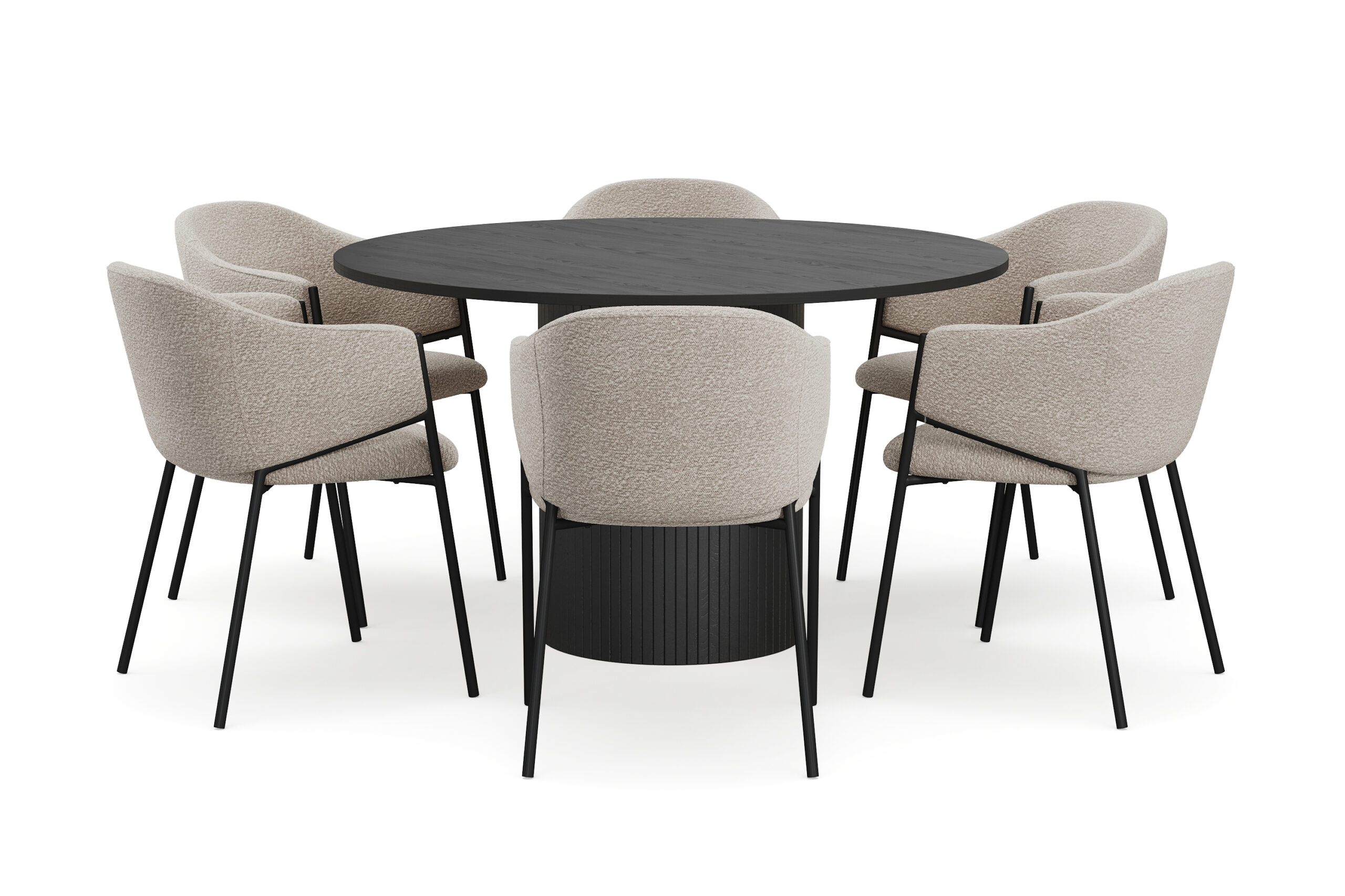 Kopparbo Rundt Spisebord 130 cm med 6 Filip Spisestole – Sort træ / Taupe Bouclé