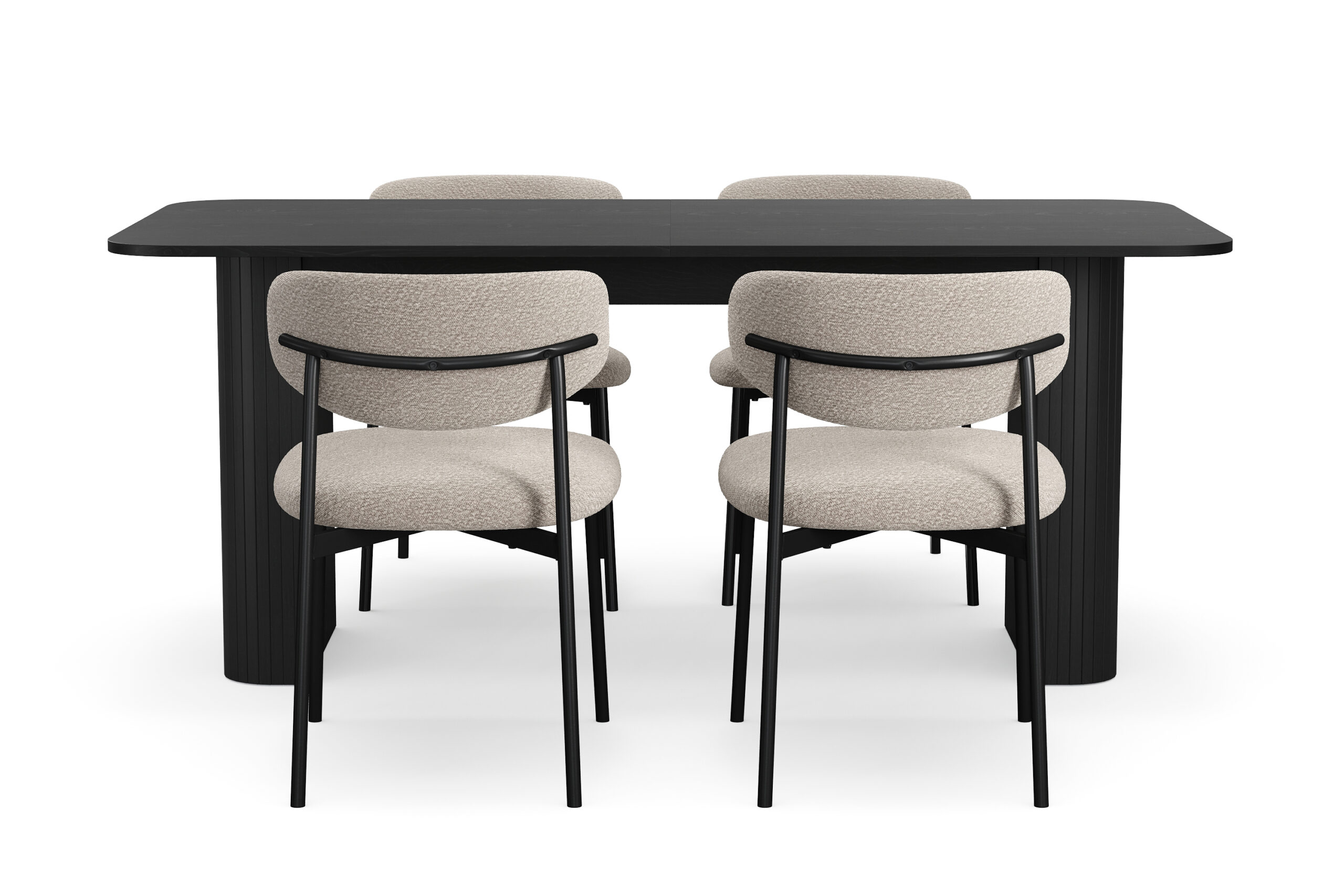 Kopparbo Spisebord 180-240 cm Udtræksbord med 4 Lucy Spisestole – Sort / Greige Bouclé / Metalben Sort