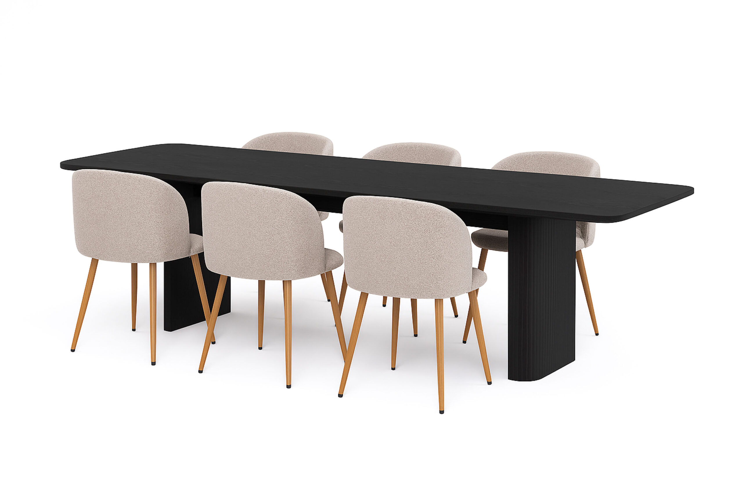 Kopparbo Spisebord 180-240 cm Udtræksbord med 6 Greya Spisestole med armlæn – Sort / Greige Bouclé / Metalben Eg