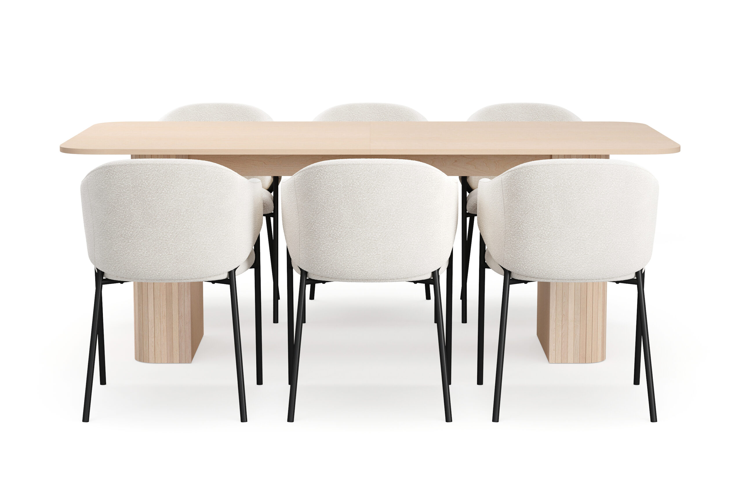 Kopparbo Spisebord 200-260 cm Udtræksbord med tillægsplade med 6 Filip Spisestole – Hvid / Hvid Bouclé