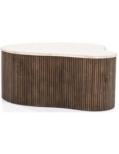 Mari sofabord udført i et moderne design, fremstillet i brunbejset mangotræ og nanobehandlet travertin. Sofabordet måler 34 cm i højden og 83 x 72 cm i bredde og dybde.