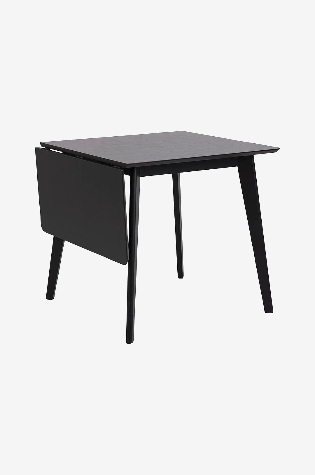 Dette spisebord passer perfekt i små rum – du kan blot slå den store ekstra bordplade op for at få ekstra plads. Bordet er fremstillet af sortmalet egefinér og gummitræ, og er et moderne m⌀bel som giver rummet et naturligt udtryk. De omhyggeligt udvalgte materialer er praktiske.